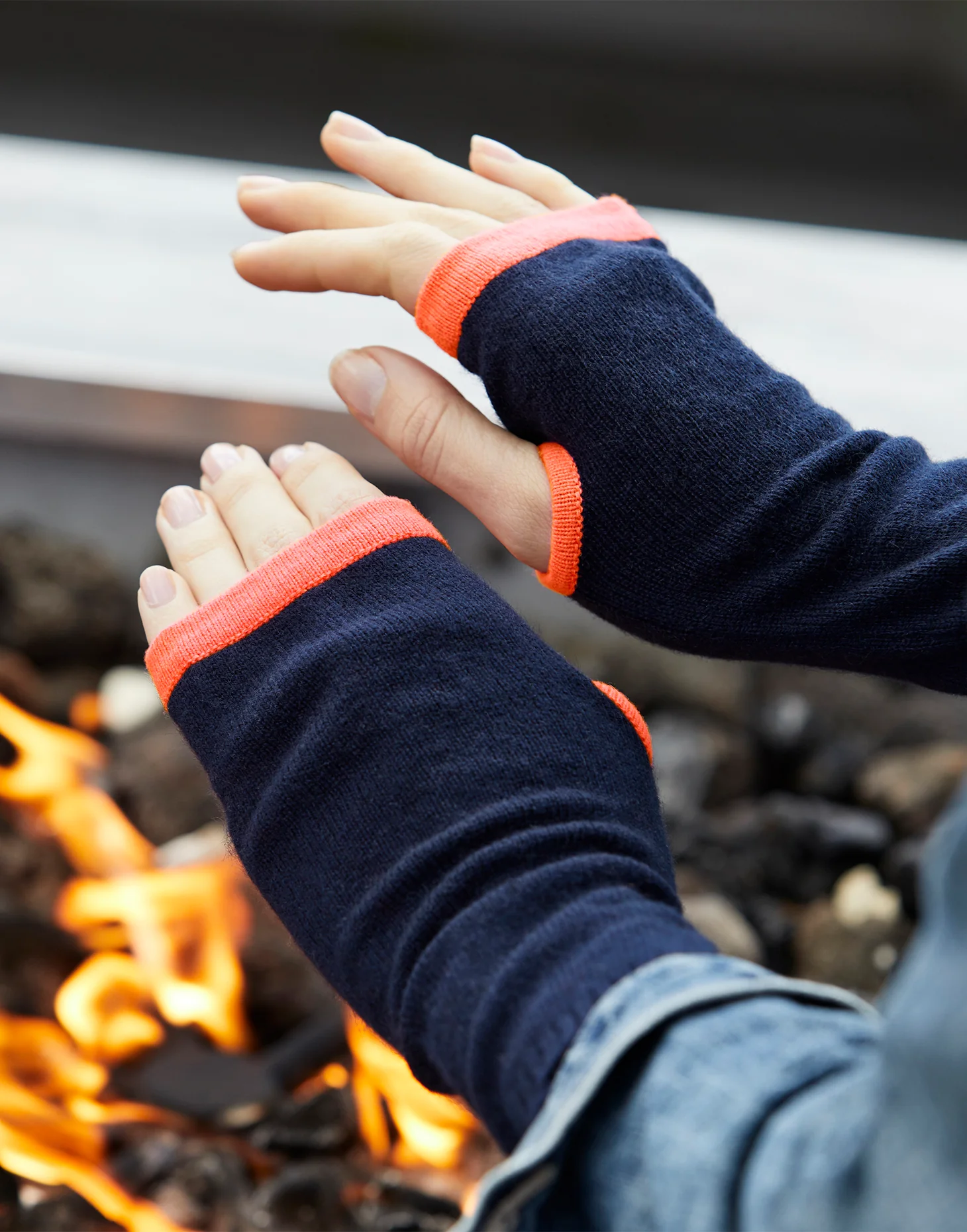 cashmere wrist warmers - navy & neon orange—